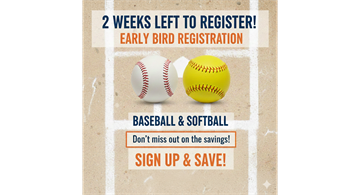 Two Weeks Left! Save Big with Spring 2026 Early Bird Registration!The countdown is on! You only have two weeks left to take advantage of our special Early Bird Savings for the Spring 2026 Baseball and Softball season!Don't miss th...